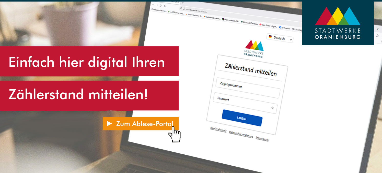 Unser Ableseportal ist 24 Stunden für Sie erreichbar. Hier können Sie uns jederzeit Ihren Zählerstand mitteilen. Alles, was Sie dafür benötigen, sind Ihre Kundennummer und Ihre Verbrauchsstellennummer.