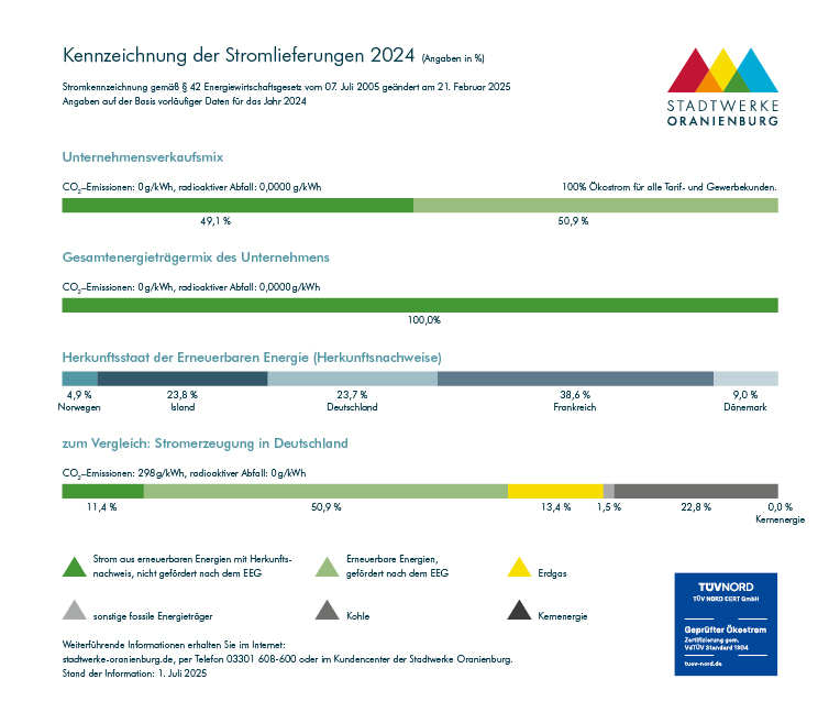 Die Stromkennzeichnung soll die Herkunft des Stroms verdeutlichen. Gemäß den Anforderungen des Energiewirtschaftsgesetzes (EnWG) liefern wir als Stromlieferant die anteilmäßige Aufteilung der Energieträger, aus denen der Strom erzeugt wird. Zusätzlich zum Anteil der eingesetzten Energieträger, auch Strommix genannt, informieren wir pflichtgemäß über die dabei entstandenen CO2-Emissionen und nuklearen Abfällen. Hier finden Sie unsere Stromkennzeichnung für das Belieferungsjahr 2024.