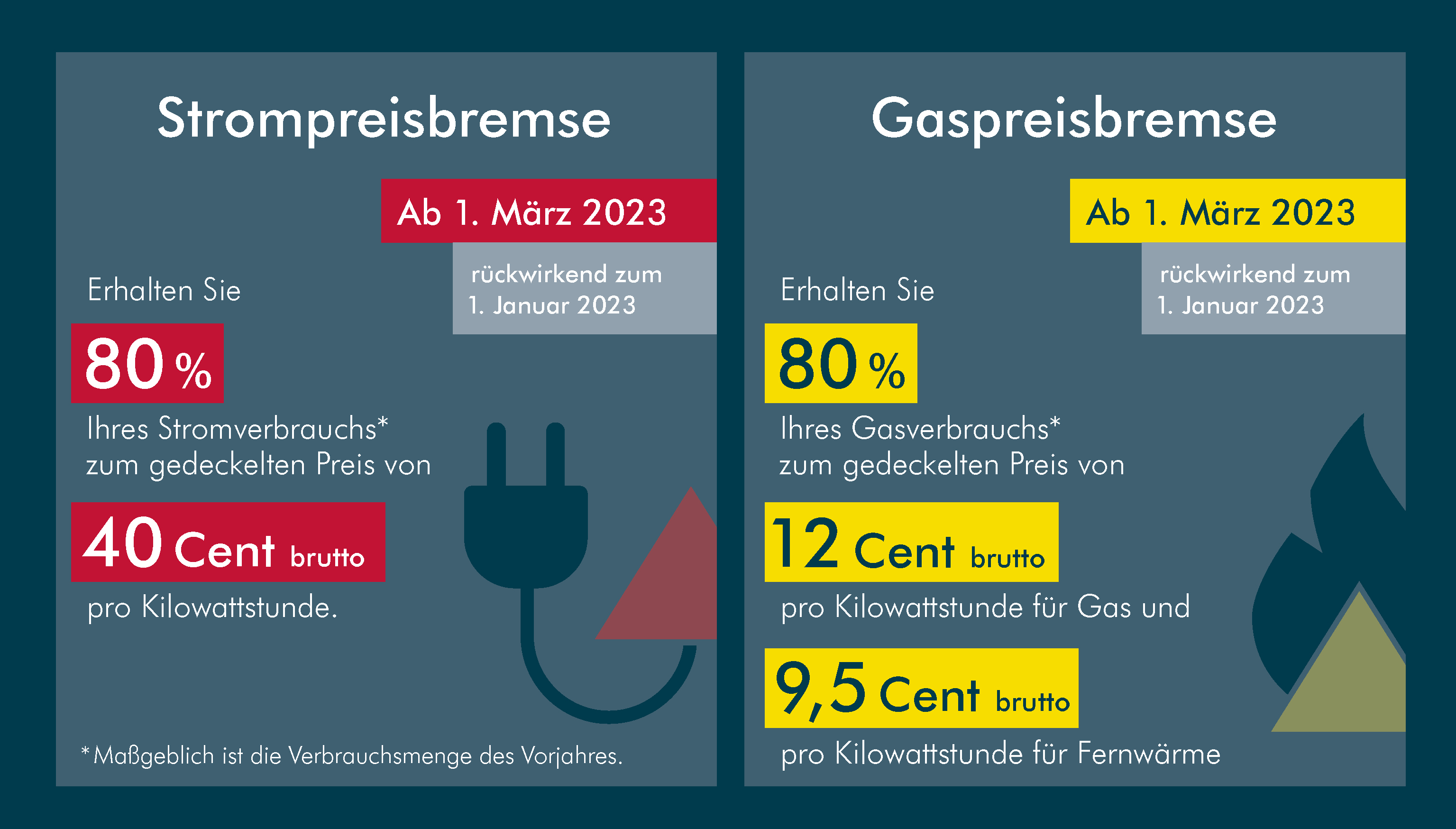 Die Preisbremsen sind so gestaltet, dass sich Energiesparen lohnt. Sie sind einfach und pauschal – für private Haushalte sowie kleine und mittelständische Betriebe. Auch für die Industrie wird die Unterstützung möglichst einfach fließen. Die Preisbremsen für Strom, Erdgas und Wärme sollen vom 1. März 2023 bis 31. Dezember 2023 gelten. Eine Verlängerung bis zum 30. April 2024 behält sich die Bundesregierung vor. Wir werden die Entlastungsbeträge aus technischen Gründen erst in den Abschlagszahlungen ab April 2023 berücksichtigen. Selbstverständlich werden rückwirkend auch die Entlastungsbeträge für Januar, Februar und März 2023 angerechnet.