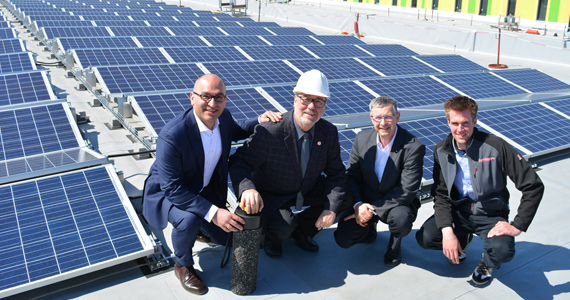 Alireza Assadi, Hans-Joachim Laesicke, Baustadtrat Frank Oltersdorf und Anlagenbauer Timm Sandmeyer auf dem Dach der Comenius-Grundschule.